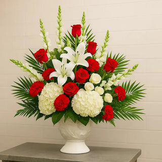 Peaceful Grace Standing Spray – White & Lavender Roses Tribute