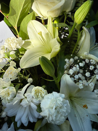 Peaceful Grace Standing Spray – White & Lavender Roses Tribute