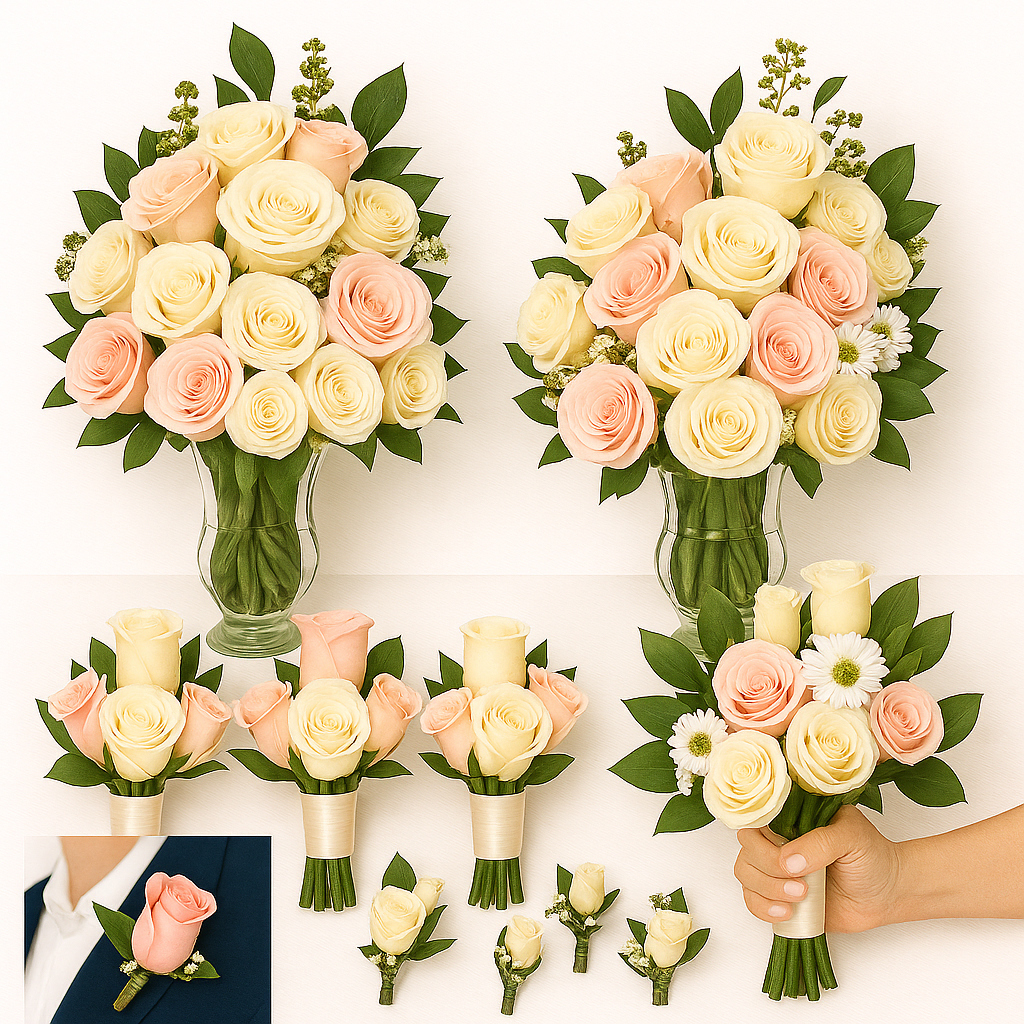This package includes all essential floral elements for your bridal party, ceremony, and reception — using premium garden roses as the focal bloom, accented with seasonal greenery and delicate filler flowers.