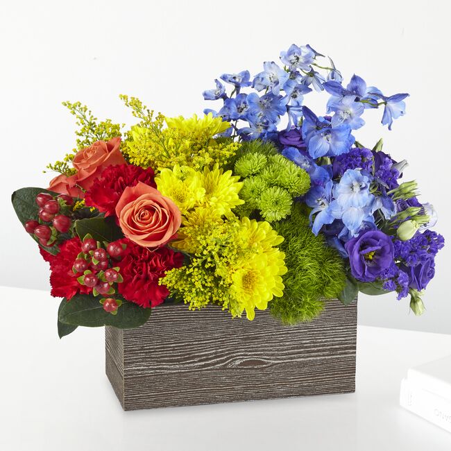 Add an artistic burst of color to any room with our Color Harmony Floral Box, a modern arrangement that combines bold reds, sunny yellows, lush greens, vivid blues, and soft purples in perfect balance. Designed in a sleek wood-style box, this creation brings together roses, delphiniums, lisianthus, carnations, chrysanthemums, and hypericum berries for a striking visual masterpiece.