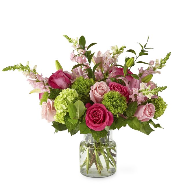 The Blushing Elegance Vase is a romantic and radiant mix of pink roses, lilies, and snapdragons, thoughtfully paired with lush greenery and bright green accent blooms. Designed in a clear glass vase, this arrangement captures the essence of beauty and grace — ideal for expressing love, appreciation, or heartfelt celebration.