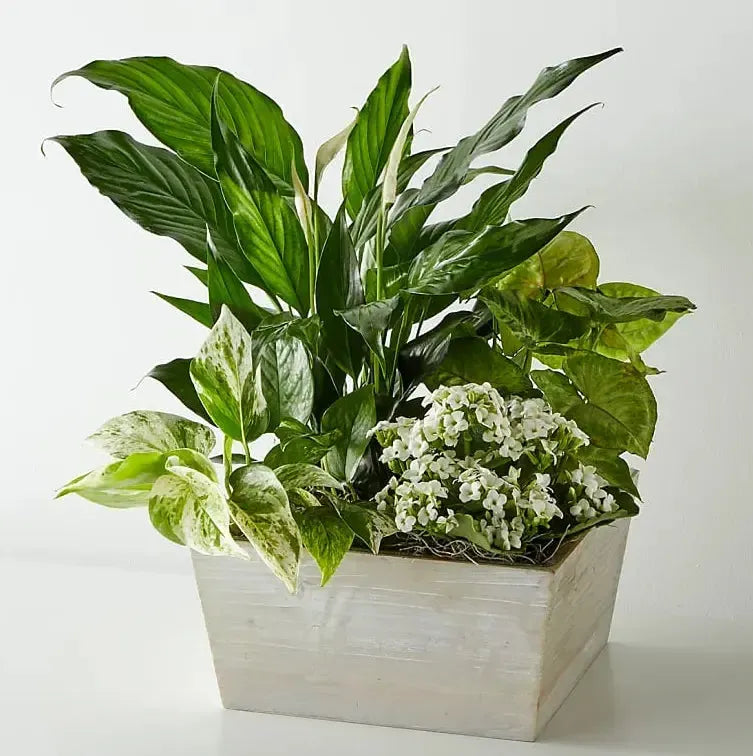Expresa tu calidez a tus seres queridos con este jardín tranquilo. Este jardín, repleto de kalanchoes y plantas de follaje exuberante, también tiene una planta de lirio de la paz de 25 a 38 cm. A medida que el lirio florece, transmitirás tu compasión de la manera más amorosa. Este jardín viene con cuatro plantas en macetas individuales aseguradas juntas en una jardinera de madera. Puede llegar en forma de capullo.