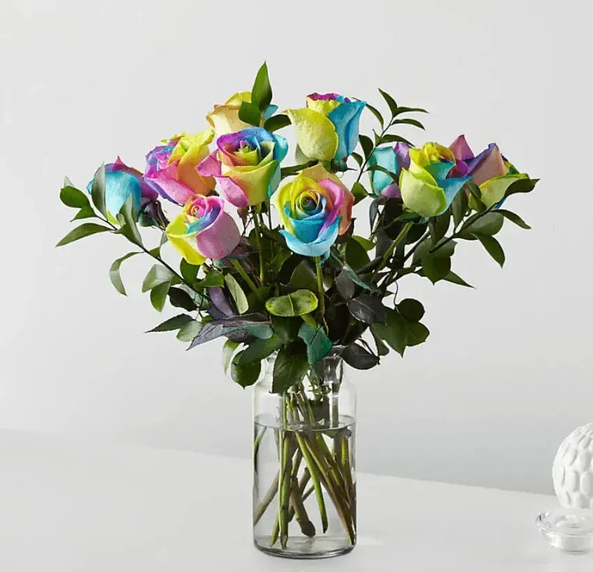 There is no more magical, natural occurrence than a rainbow - have it be in the sky or in a fresh floral arrangement. Our bouquet of rainbow hand-dyed roses symbolizes the majestic phenomenon, with its brilliant colors in each bloom.