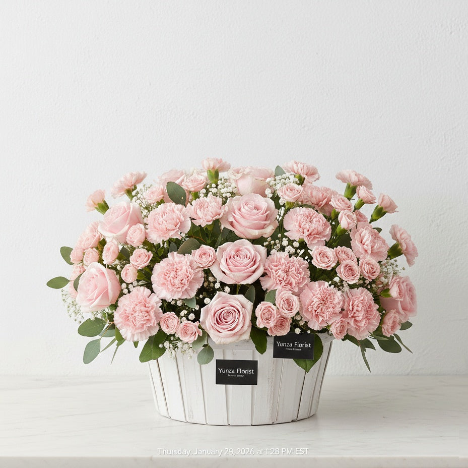 The arrangement is presented in a charming, round white wooden basket that features a rustic, paneled texture. This classic white vessel provides a clean, bright contrast to the soft pink tones of the flowers, making the entire display feel light and airy. It is finished with the signature Yunza Florist black label for a touch of modern sophistication.