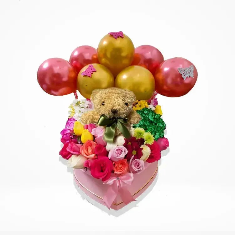 Delight your loved ones with this enchanting gift featuring a heart-shaped arrangement of vibrant roses, cheerful mixed blooms, and a charming plush teddy bear at the center. Accented with shimmering golden and pink balloons adorned with butterfly details, this arrangement is perfect for birthdays, anniversaries, or any celebration. Presented in an elegant pink box with a satin ribbon, it’s a heartwarming gift that combines fun, beauty, and love in one unforgettable package.