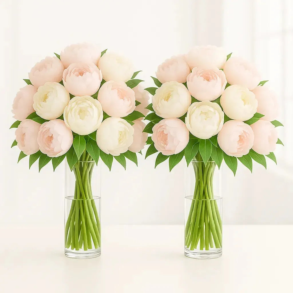 2 Reception/Altar Arrangements (24–30 peonies each in large clear vases with greenery)