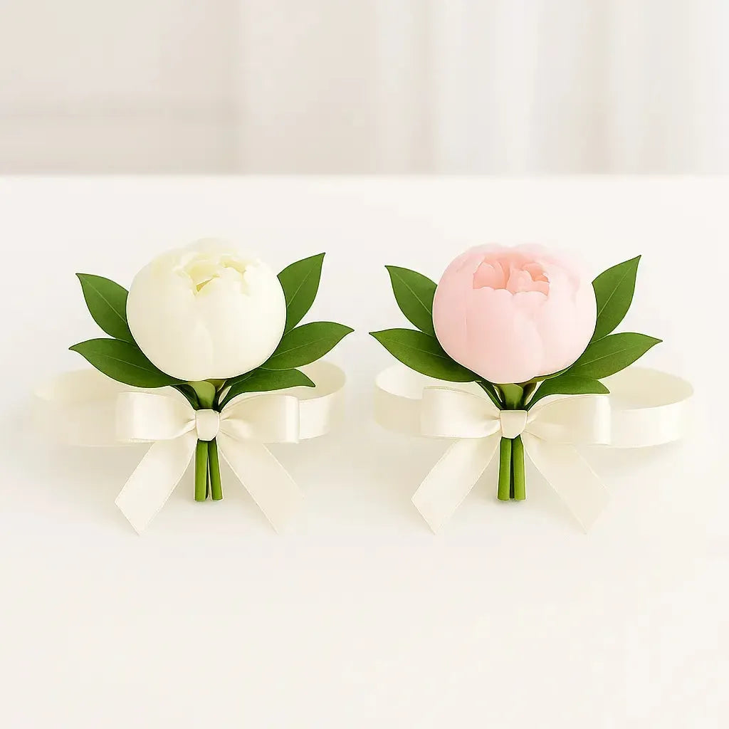 1 Groom’s Boutonnière + 4 Groomsmen Boutonnières (single peony with greenery and ribbon wrap)