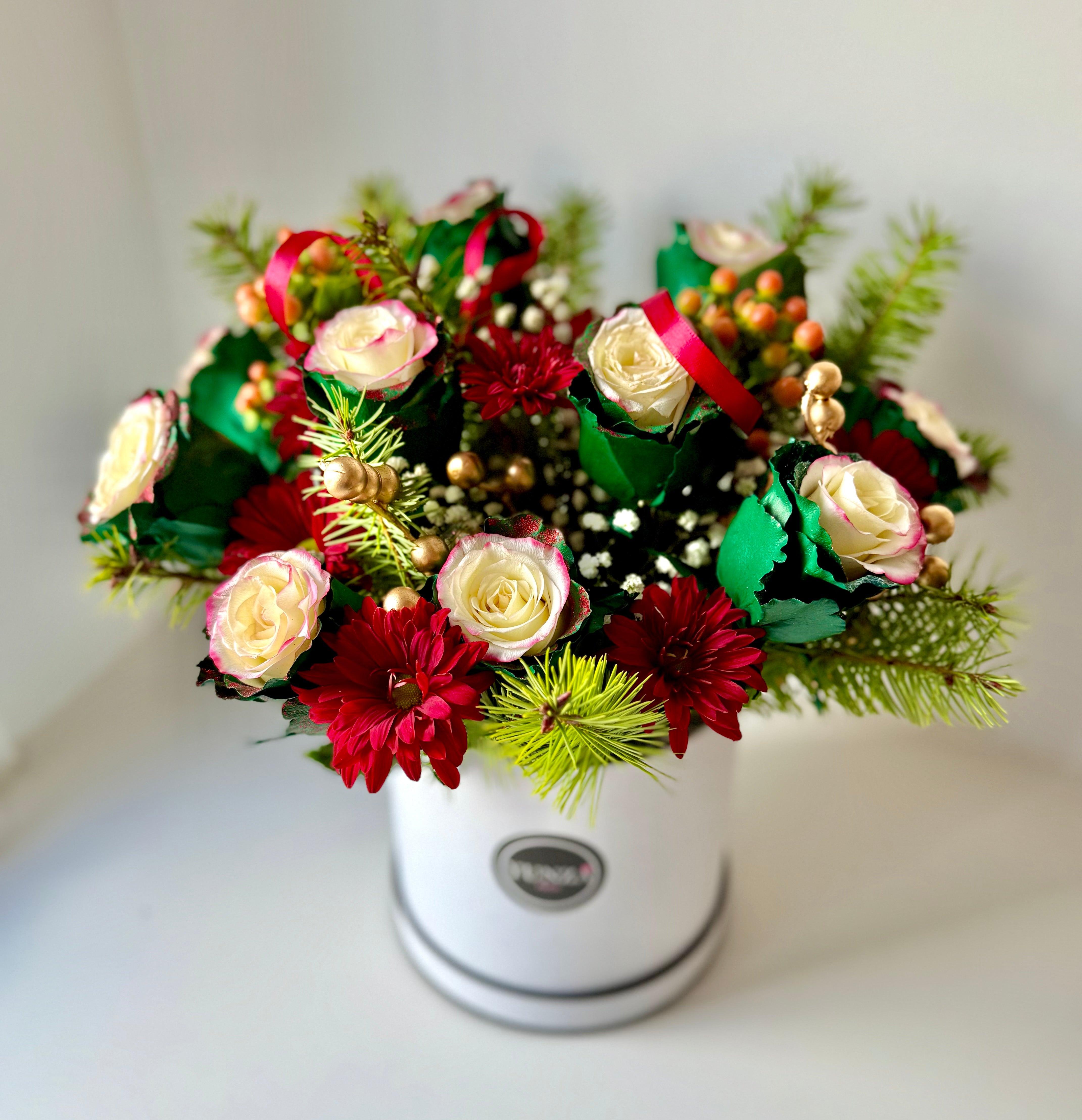 This arrangement captures the magic of the holiday season with its vibrant, contrasting colors and lush textures. Every stem is thoughtfully placed to create a balanced, full, and luxurious look—perfect as a Christmas centerpiece, holiday gift, or winter décor accent.