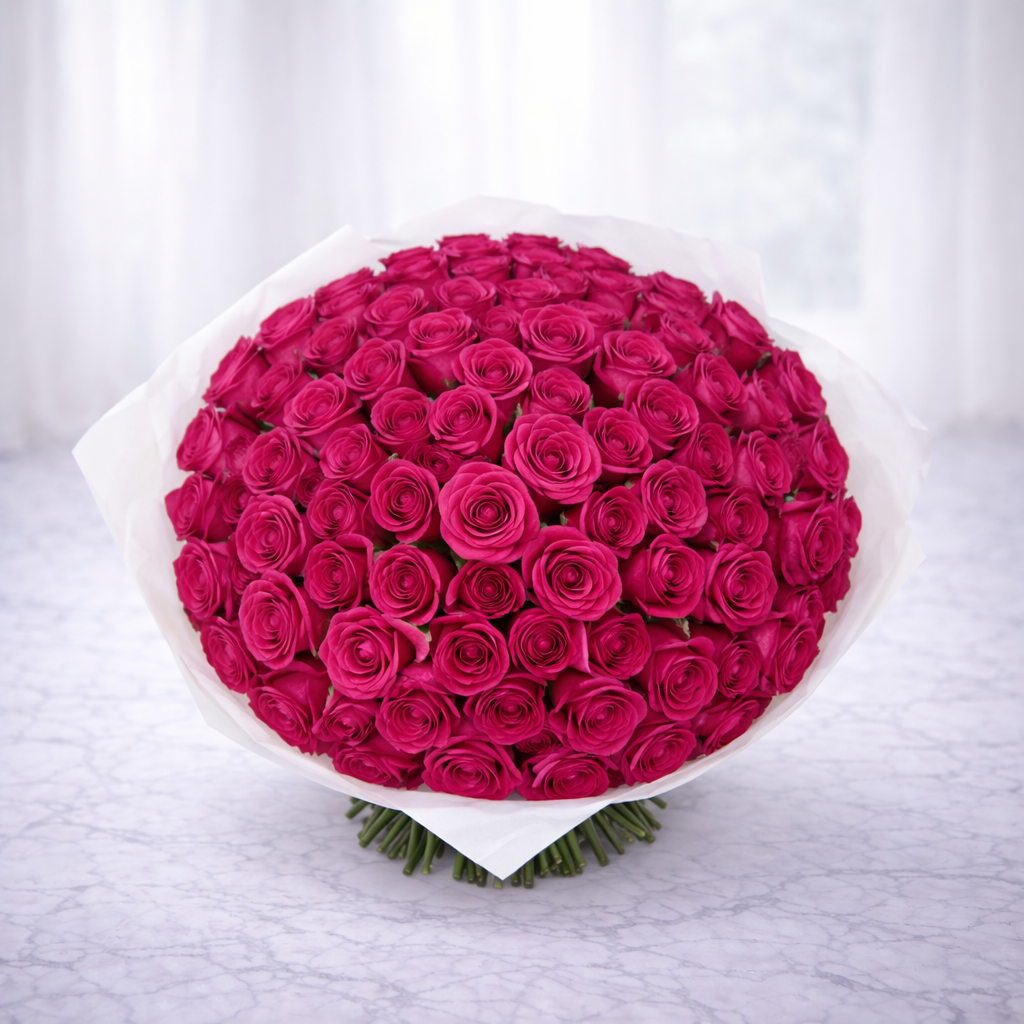 This luxurious arrangement features 100 fresh, hand-selected roses, carefully arranged in a full dome shape and wrapped in elegant white paper for a timeless and sophisticated look.