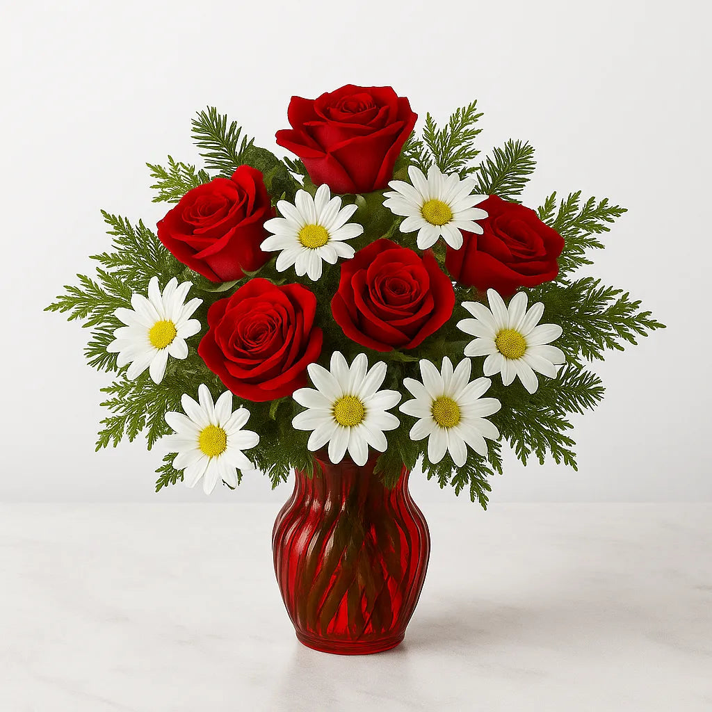 Each bouquet is thoughtfully arranged by our Yunza Florist designers using the freshest seasonal stems available. The vibrant red roses symbolize love and celebration, while the crisp white daisies bring softness and charm. Accented with fragrant holiday evergreens, this arrangement instantly brightens any space with a timeless Christmas feel.