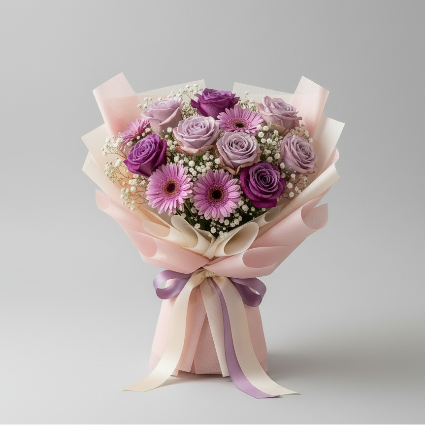 Wrapped in layered pastel purple and cream Korean-style paper and finished with a satin lavender ribbon, this design captures the essence of modern floral luxury. Each bloom is carefully selected for its freshness and beauty, creating an arrangement that feels romantic, stylish, and truly unforgettable.